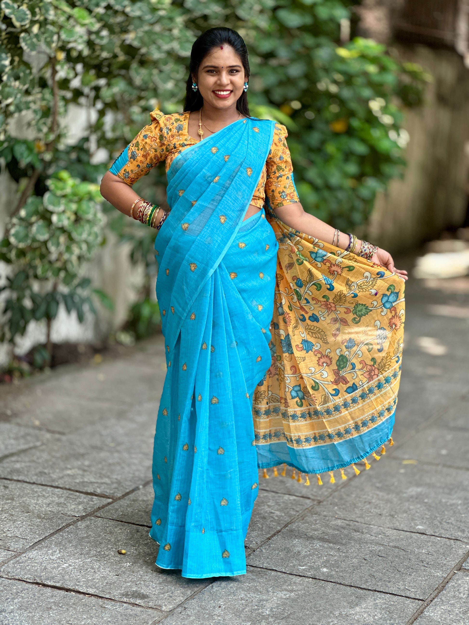 LINEN COTTON SAREE WITH KAKAMKARI BLOUSE AND PALLU